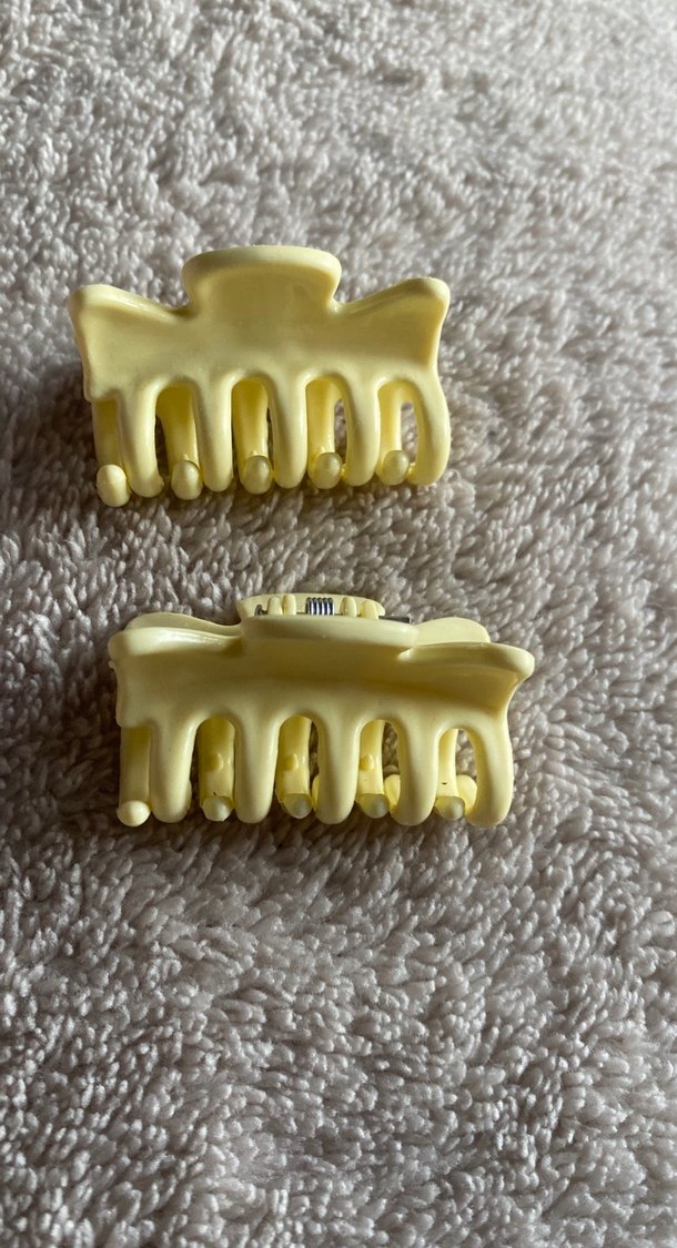 Pastel sarı renkte, plastikten yapılmış, mandal tokalar seti. Minimalist ve sade tasarıma sahiptir.