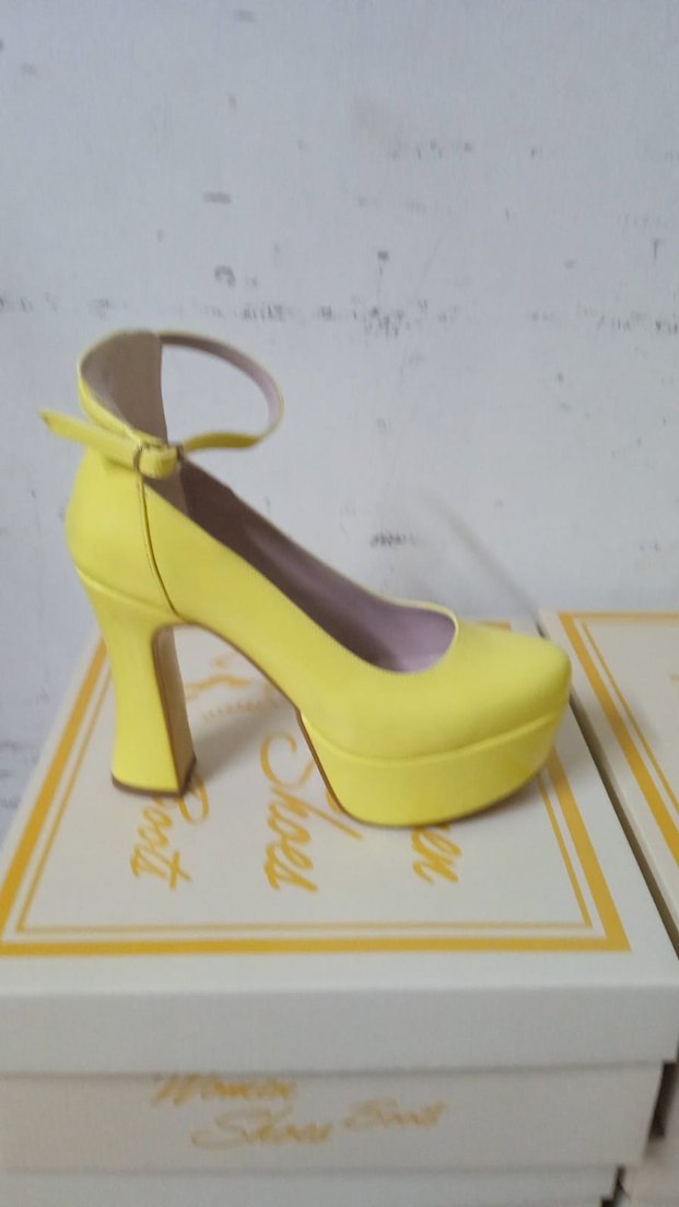 Sarı, tokalı bantlı platform topuklu kadın ayakkabı. Pastel tonlarda, lastik malzemeden, desen içermeyen, parti için uygun.
