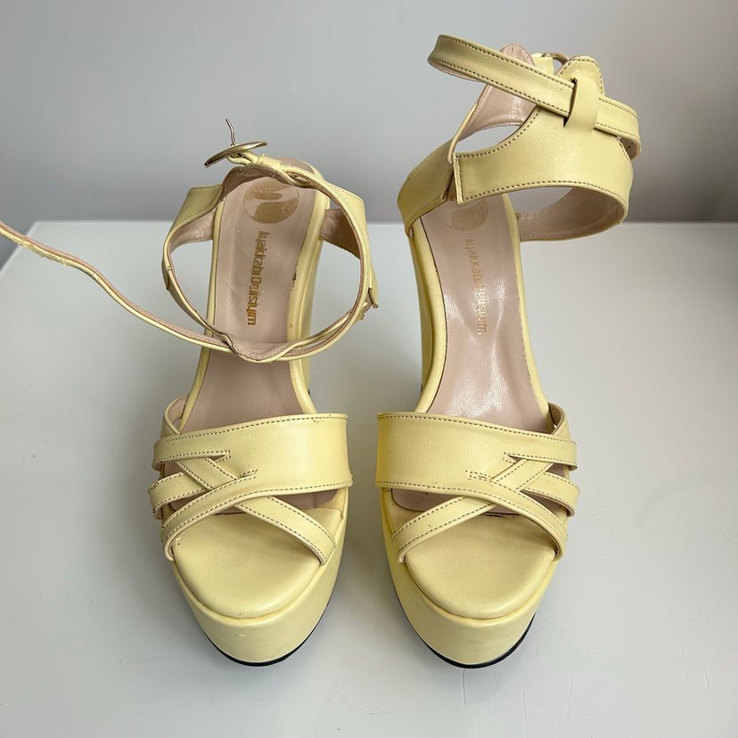 Sezonun gözde rengi sarının en güzel tonu. Sadece topuk kısmında değil ön tarafında da yükseklik olduğu için göründüğünden daha rahat. 13cm topuk, 5cm ön taraf yüksekliği. Bilekten bağlamalı. Kesinlikle ağır değil. Bir kere giyildi. Markası Ayakkabı Delisiyim.