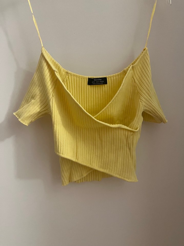 Sarı renkli, askılı kollu ve kayık yakalı, pliseli detaylı, kısa ve fitted kesim triko bluz. Casual sokak stili için uygun.