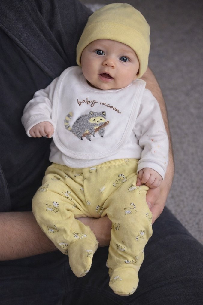 Pofuduk, pastel sarı baskılı pantolonlu bebek hastane kıyafeti, uyumlu şapka ve rakun işlemeli beyaz önlük ile tamamlanmıştır.