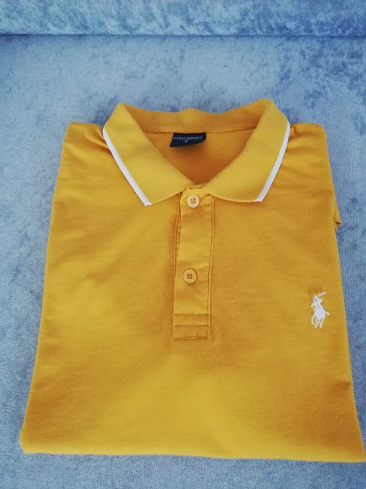 Sarı renkli, düğmeli ön kısmı ve polo yaka kısa kollu, rahat kesim erkek tişörtü. Yumuşak dokulu kumaştan, günlük sokak stiline uygun. Xl yazıyor ama m beden gibi