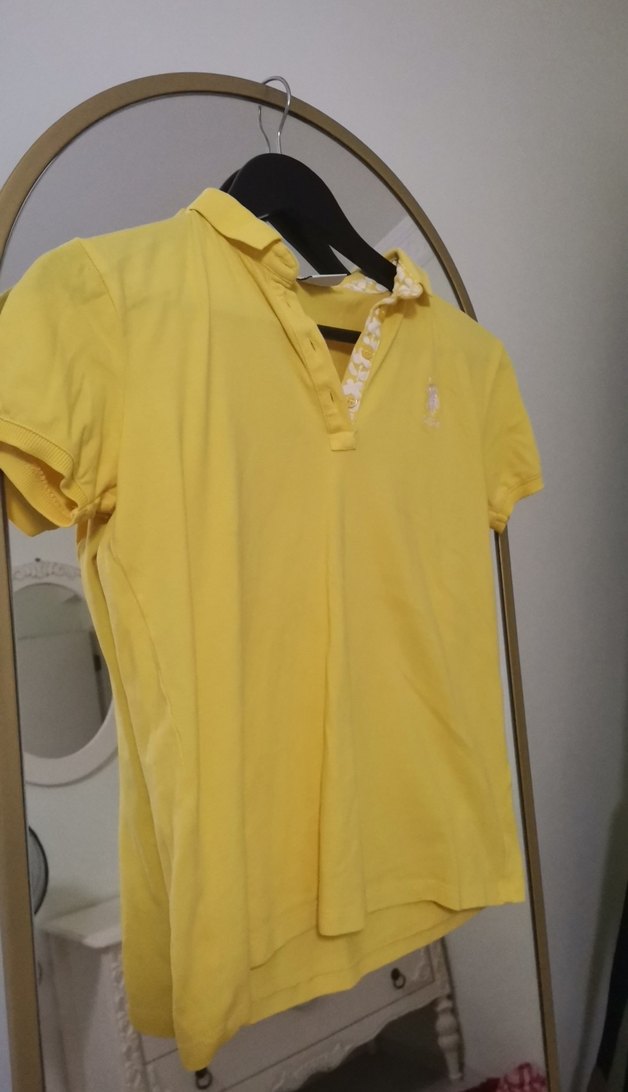 Sarı renkli, düğmeli polo yaka ve kısa kollu, vücuda oturan kadın tişörtü. Yumuşak sentetik kumaştan, yakada baskılı detaylar içerir.