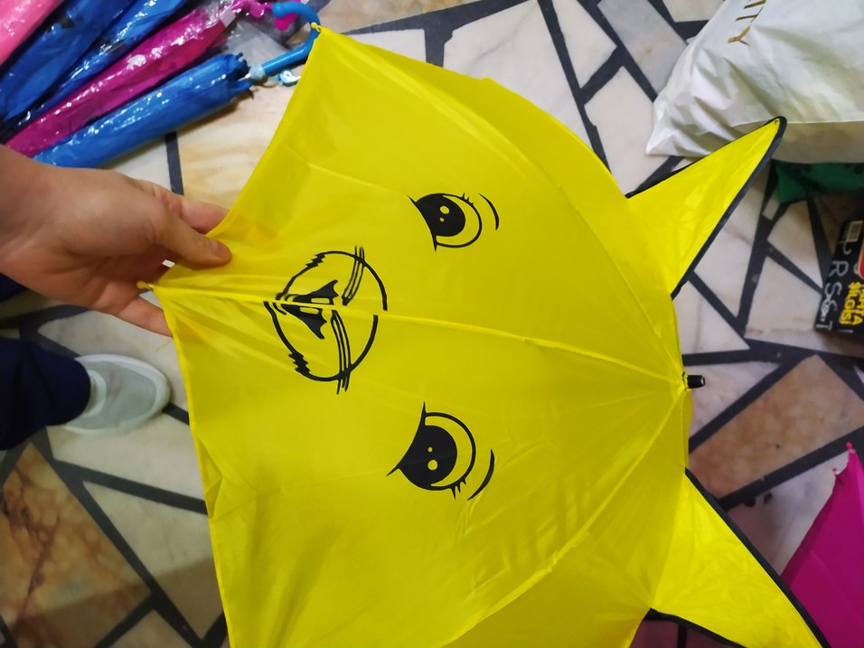 Sarı, fermuarlı, pop art yüz desenli kadın şemsiye, renkli ve avant-garde tarzları sevenler için.