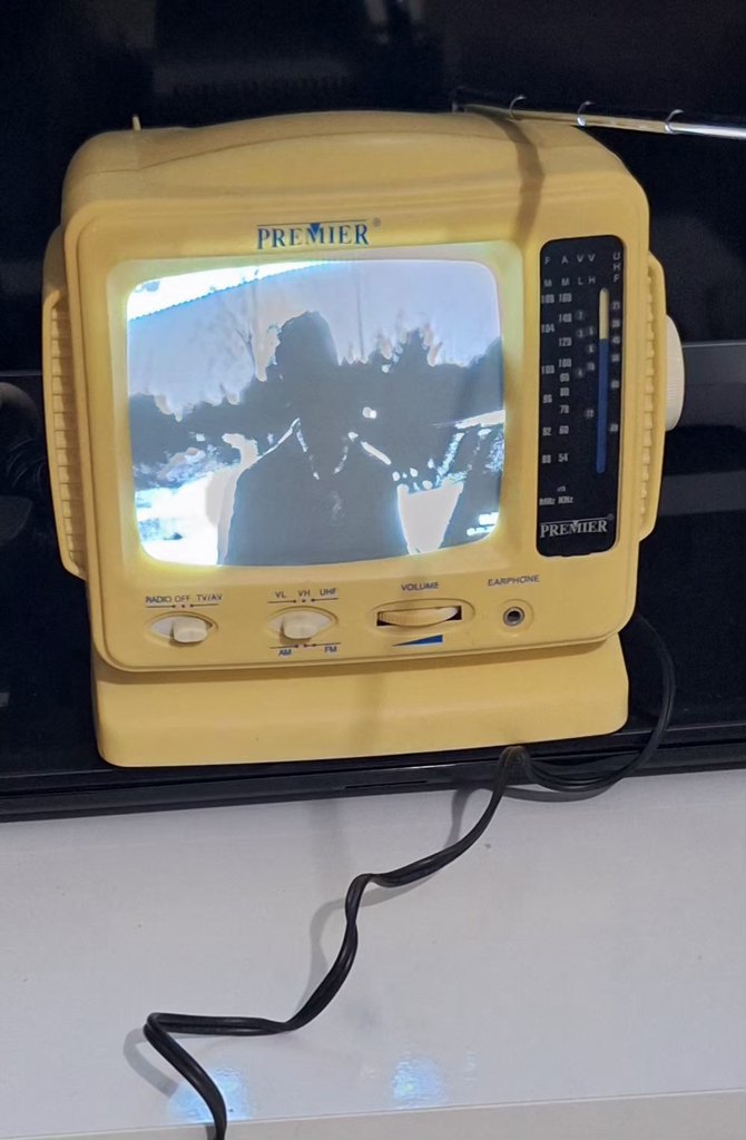 premier televizyon, radyo Ses kontrolü, ayar düğmeleri ve kulaklık girişi bulunan sarı Premier retro tasarımlı monitör. Küçük ekranda siyah beyaz görüntü gösterir. cihazda hiçbir sıkıntı yok çalışıyor Her şey orijinal aynı cihazdan 2 adet bulunur