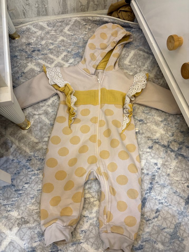Sarı puantiyeli baskıya sahip, ön kısmında dantel fırfır detayları bulunan, kapüşonlu bebek tulumu. Önde fermuar ve uzun kolludur.