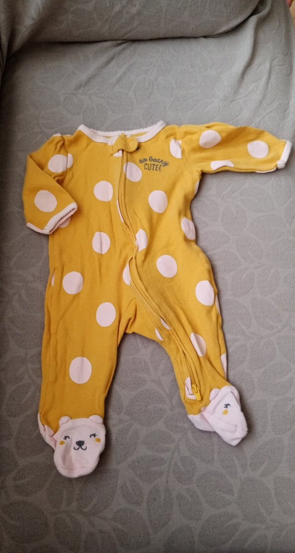 Sarı renkli, uzun kollu, yuvarlak yakalı bebek tulumu. Renkli puantiyeli desenli, fermuarlı ve ayakları ayıcıklı desenlidir.