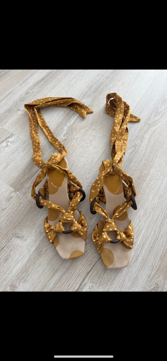 Sarı puantiyeli ipek görünümlü kurdeleli, bohem ve Paris tarzı blok topuklu sandalet, günlük kullanım için uygun. Sorunsuz markası orijinal mango