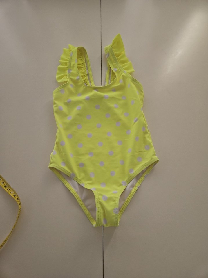 Sarı renkli, puantiyeli, askılı ve fırfırlı kollara sahip kız çocuk mayosu, plajda rahat kullanım için uygundur. icinde ufak leke var beden yazmad9gi icin ölçüp koydum