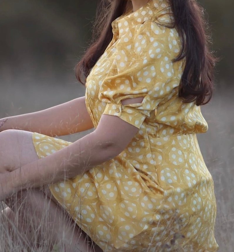 Sarı, parlak puantiyeli midi elbise, yakalı ve kısa kolludur. Bol kesim ve düğmeli ön detaylarıyla bohem vintage tarzını yansıtır. Marka: adL.