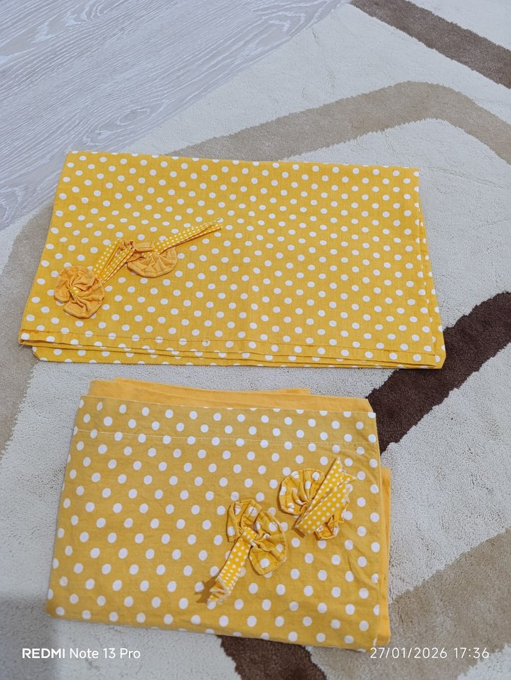 Sarı renkli, renkli puantiyeli nevresim ve çarşaf takımı, dekoratif fiyonk detaylarına sahiptir. Yumuşak ve rahat bir kumaş dokusuna sahiptir. ️