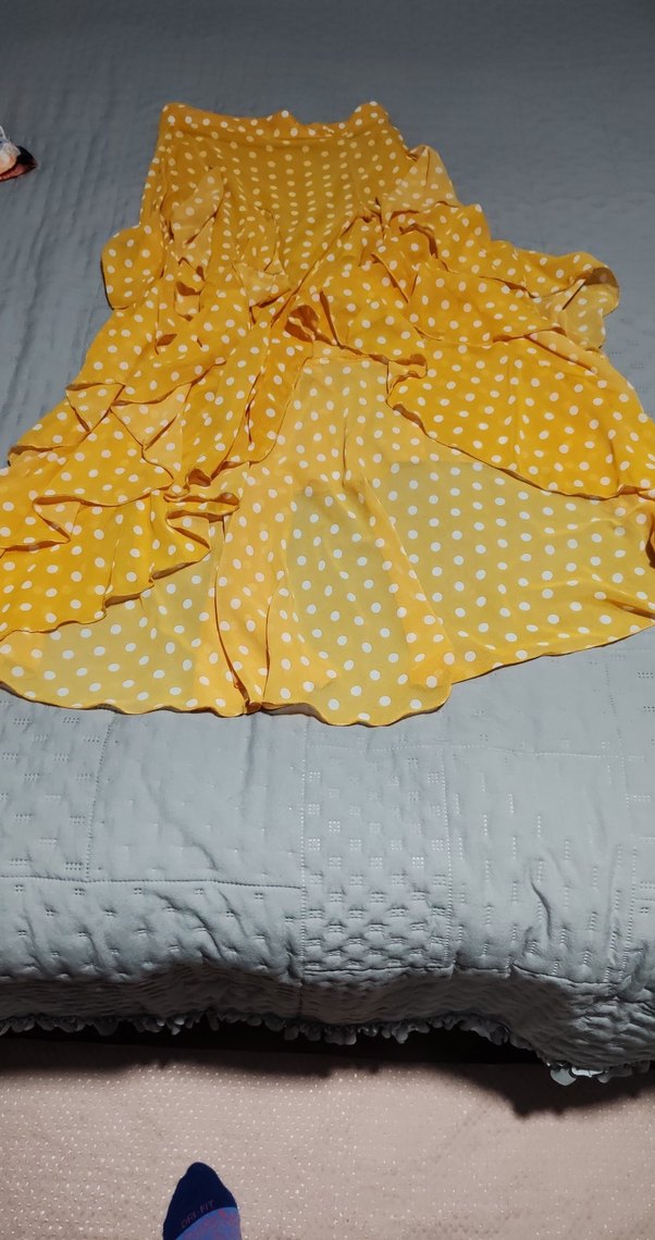 Sarı puantiyeli hamile eteği, parlak kumaş ve fırfır detaylarına sahiptir. Bol kesim ve uzun boydadır, bohem tarzına uygundur.