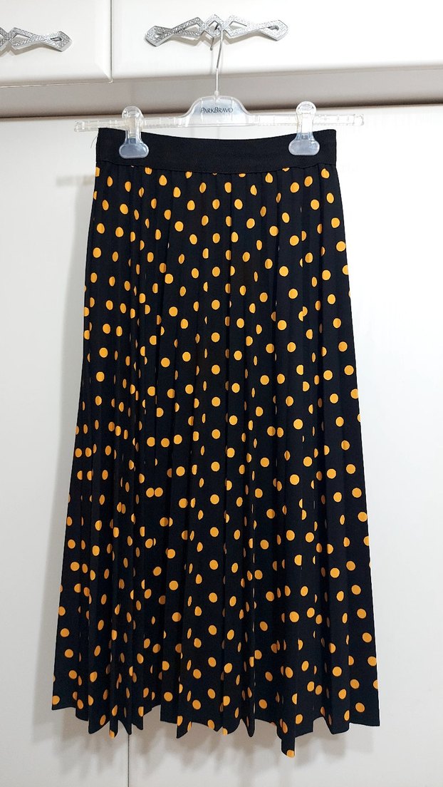Sarı puantiyeli koyu renkli, pilili ve bol kesim uzun etek. Bohem ve retro tarzına uygun. Beli lastikli olduğundan 44 bedene kadar uyar. Astarlı değil ama kalın krep kumaş. Piliselidir, ütü gerektirmez