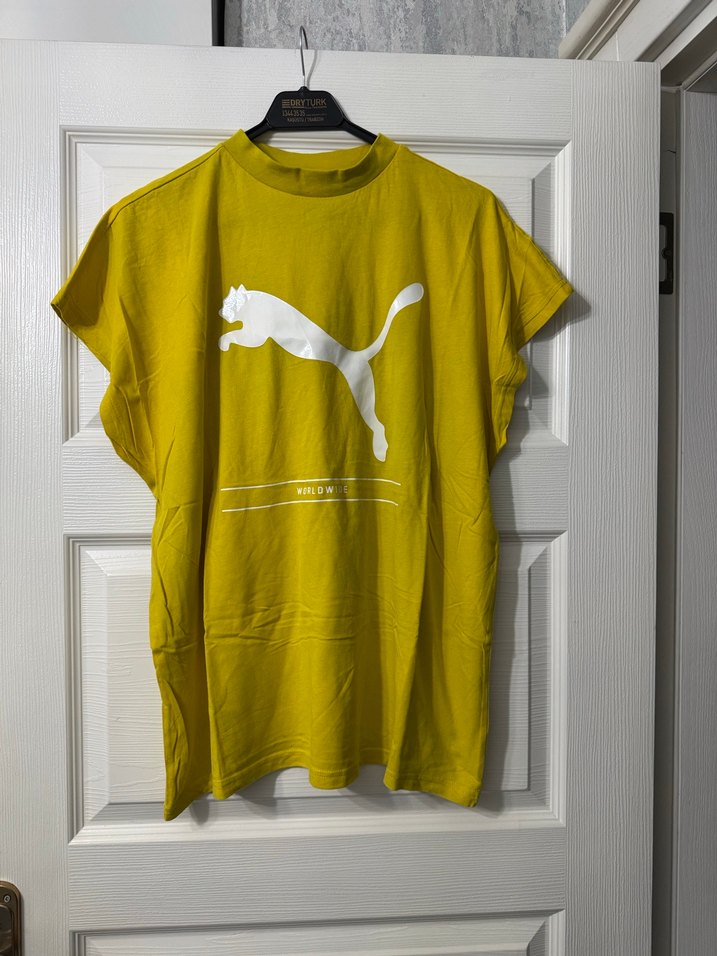 Sarı renkli, kısa kollu, yuvarlak yaka Puma kadın tişörtü. Sentetik kumaştan, rahat kesimli, sportif ve günlük kullanıma uygun.