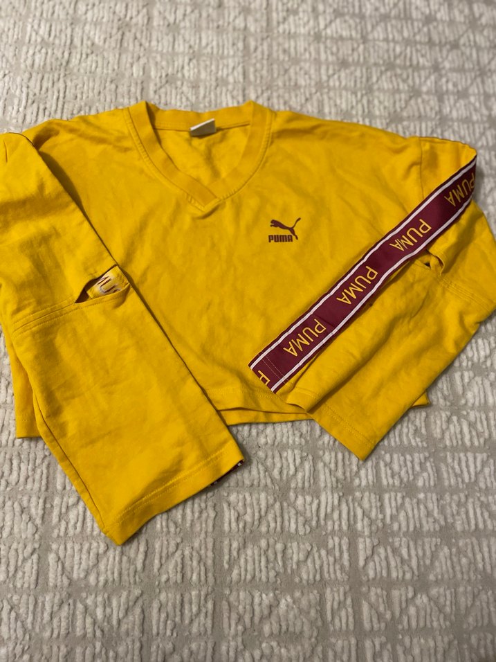 Sarı Puma kadın sweatshirt, V yakalı ve uzun kollu, kolunda marka bantları bulunur. Rahat kesimi ve yumuşak dokusuyla günlük kullanım için uygundur.
