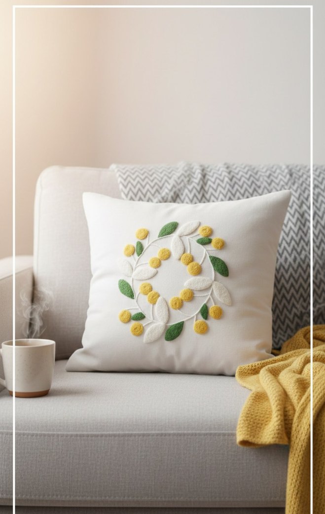 Pastel sarı nakışlı çiçek desenleriyle süslenmiş, yumuşak kumaştan modern klasik tarzda dekoratif yastık. Punch nakışı ile işlenmiştir.