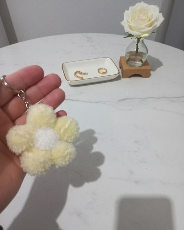 Yumuşak püsküllü çiçek tasarımlı pastel sarı bohem tarzı anahtarlık, rahat ve retro görünüm için uygundur.