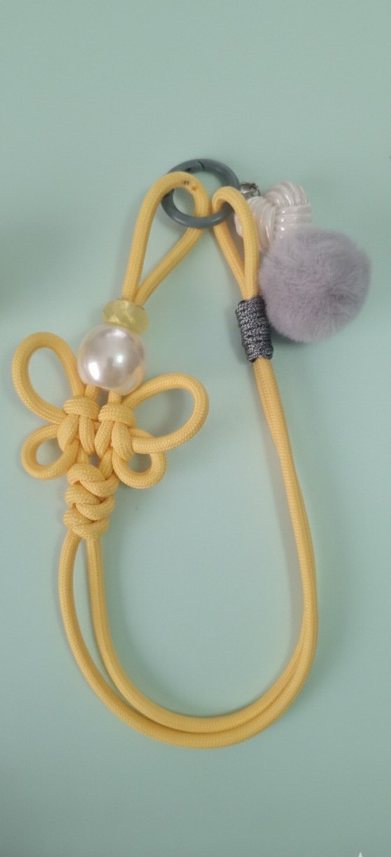Sarı renkte, pastel püskül ve boncuk detaylı bohem tarzda minimalist ve retro anahtarlık. Hippie tarzına uygun.