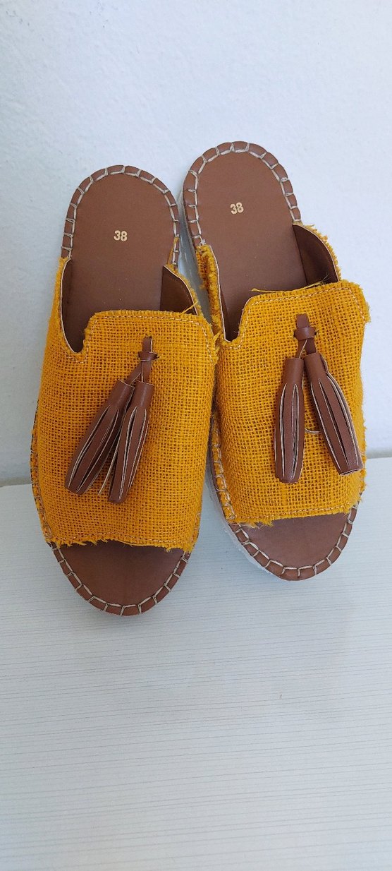 Sarı renkli, işlemeli sentetik kumaştan yapılmış, püsküllü ve dolgu topuklu bohem tarzı terlik. Numara 38.