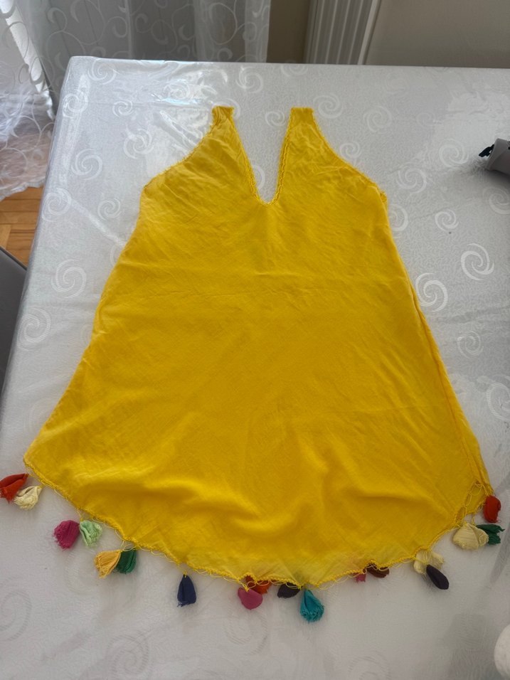 Sarı renkli, tekstil kumaştan, V yakalı, salaş kesim plaj elbisesi. Kenarlarında renkli püsküller bulunur. Bohem ve retro tarzda, kolsuz ve batik desenlidir.