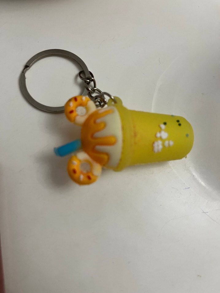 Sarı renkte, püsküllü ve renkli içecek figürlü kadın anahtarlığı. Minimalist ve rock punk tarzını yansıtan şık bir aksesuar.