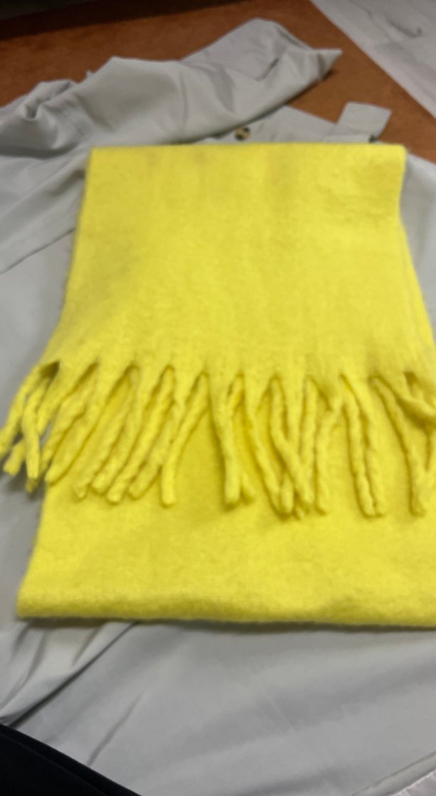 Canlı sarı renkte, yumuşak ve sıcak dokulu püsküllü kadın şalı. Rahat ve bohem tarz sunar.