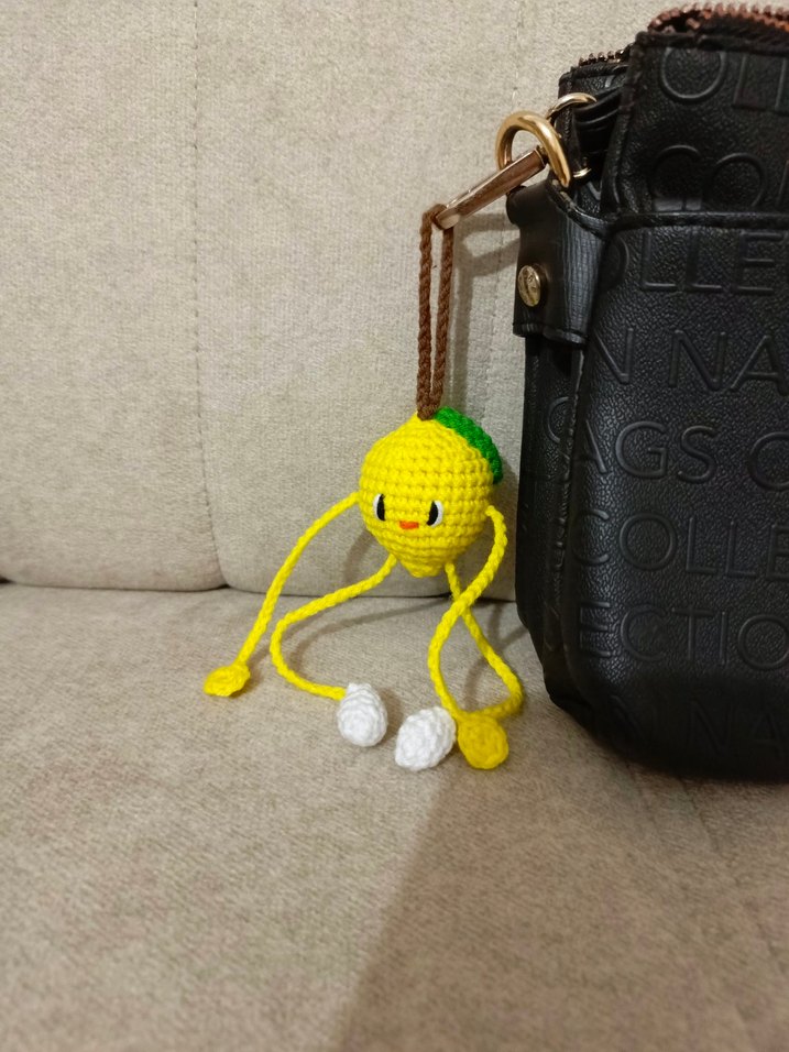 Sarı renkli, püsküllü ve minimalist tasarıma sahip anahtarlık. Trendy ve rahat sokak stili için uygun.