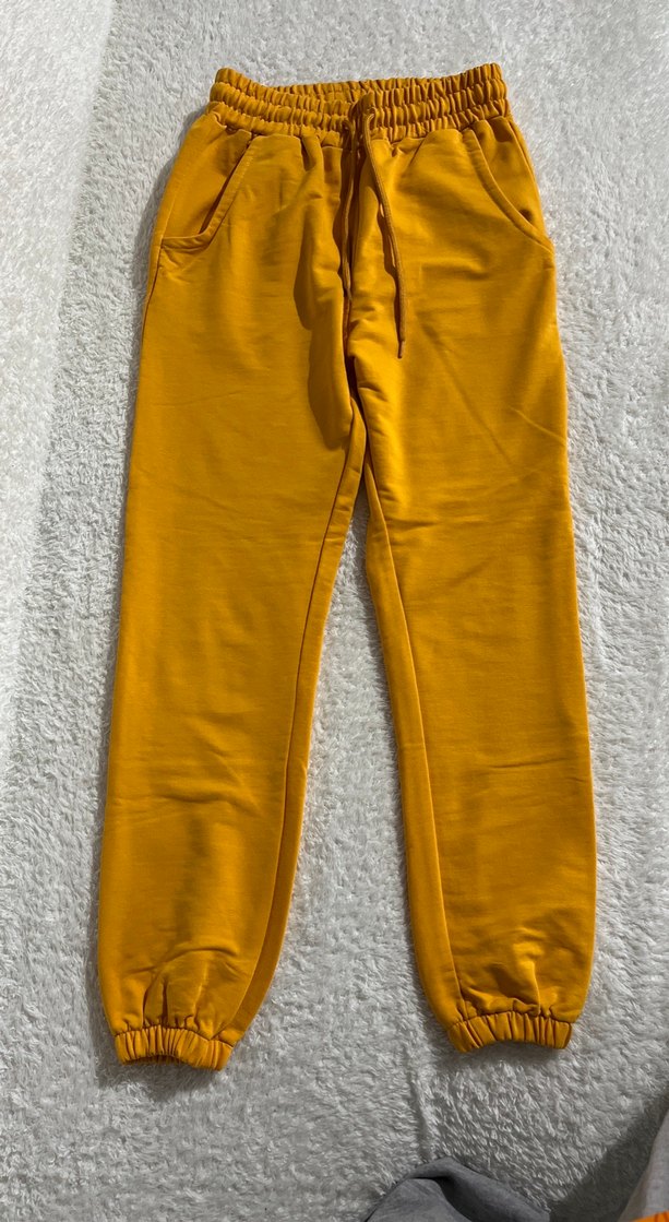 Parlak sarı renkte, rahat kesim kız veya erkek çocuk eşofman altı. Yumuşak ve sıcak kumaştan, bel ve bileklerde lastikli, günlük sokak stili için uygun.