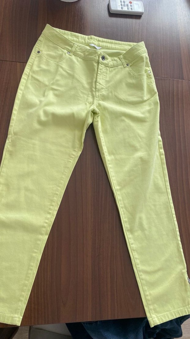 Sarı regular fit kadın kot kumaş pantolon, midi boy ve fermuarlı detaylara sahip, yumuşak kot kumaştan üretilmiştir. Günlük rahat kullanım için uygundur.