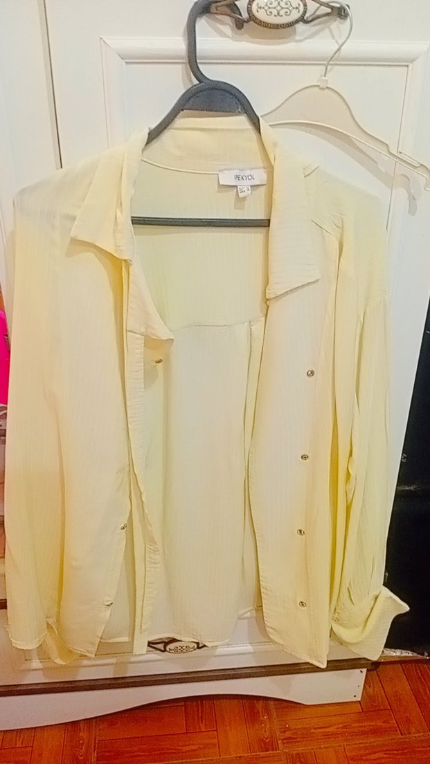Sarı renk, uzun kollu, çıtçıt detaylı, ipeksi dokulu, normal kesim kadın gömleği. bisiklet yaka tasarımıyla ofis ve günlük kullanıma uygundur.
