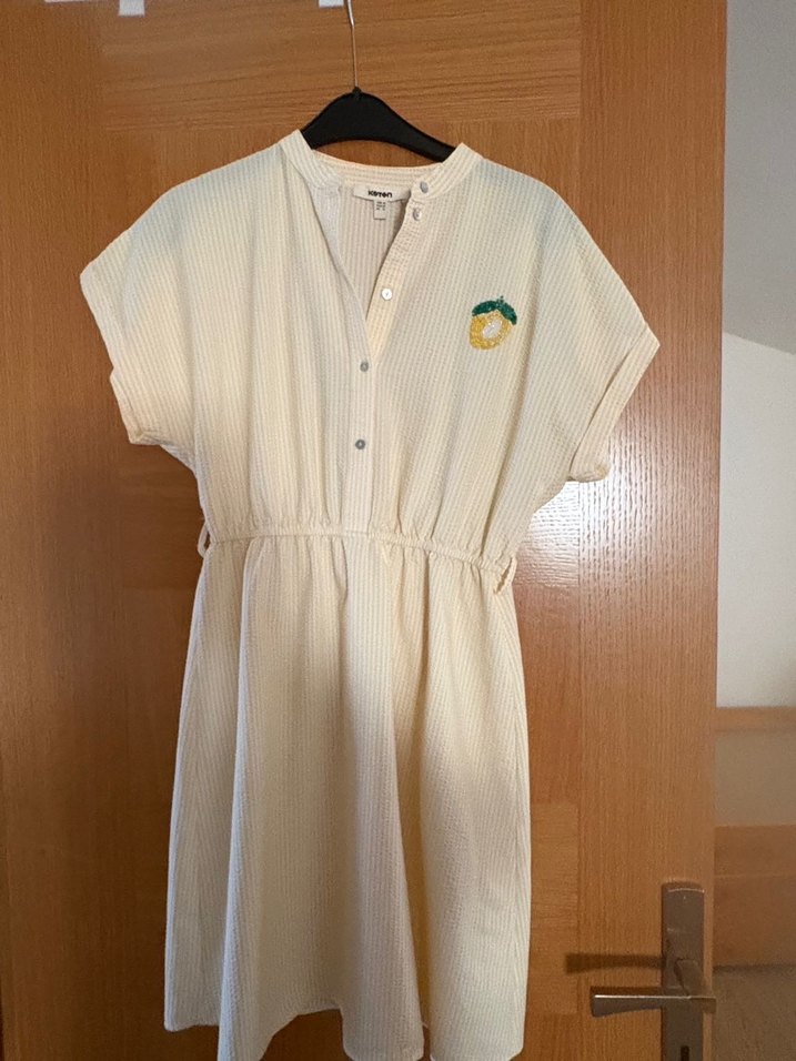 düğmeli ve nakış detaylı sarı renk midi elbise. Kısa kollu, bol kesim ve yuvarlak yaka ile günlük rahat kullanıma uygundur.
