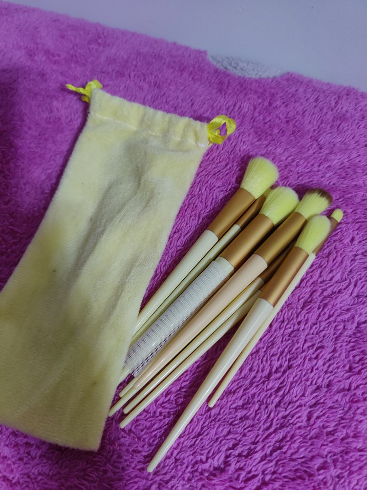 Yumuşak kıllı sarı renk makyaj fırçalarından oluşan set, sarı ipli kesesiyle saklama sağlar. Çeşitli makyaj uygulamaları için uygundur. ✨hiç kullanılmadı