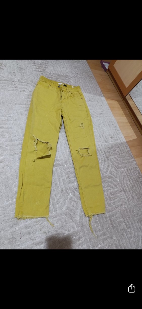 sarı renkte ve rahat kesim midi boy kadın jean. Günlük kullanım için yırtık detaylı, sokak stiline uygun sade tasarım.