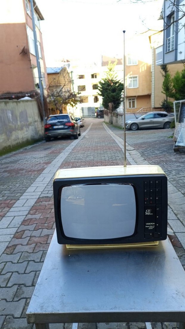 Küçük ekranlı, yan tarafında manuel kontrol düğmeleri ve üstünde anten bulunan sarı renk retro televizyon monitörü. meraklısına uygun fiyat