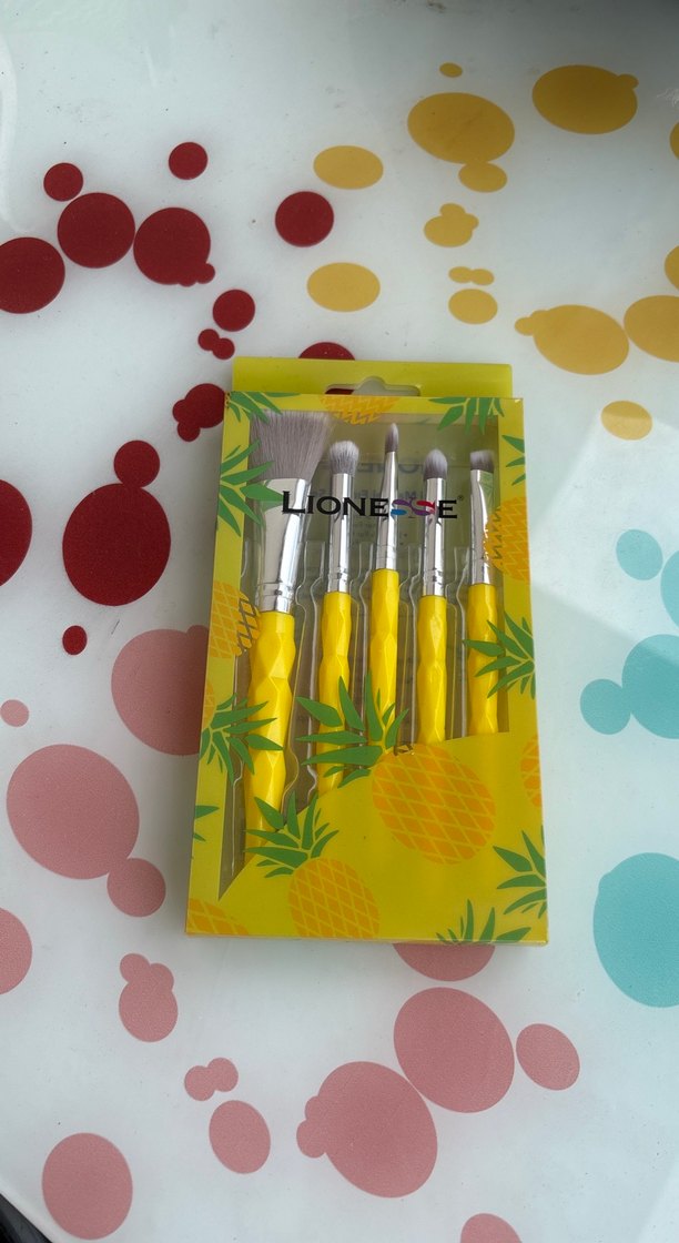Sarı saplı, farklı makyaj uygulamaları için 5 renkli fırça içeren set. Yumuşak kıllara sahip, ananas desenli ambalajda.