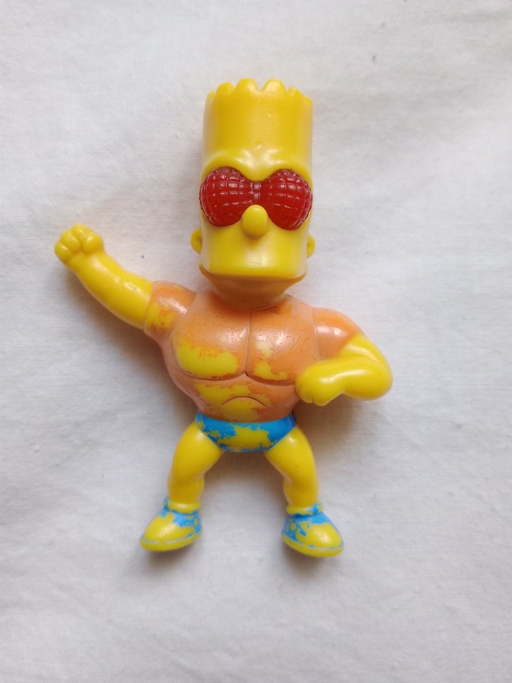 Kaslı detaylara ve kırmızı güneş gözlüklerine sahip, dinamik pozda sarı renkli aksiyon figürü, ayakkabı ve şortta mavi detaylı-2011 burger king ürünü pil yeri var çalışıp çalışmadığını kontrol etmedim boyası biraz atmış resimde gördüğünüz gibi korunaklı şekilde kargo olur