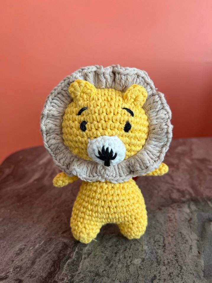 Renkli, el örgüsü sarı aslan peluş oyuncak, yumuşak bej yeleği ve basit yüz detaylarıyla tasarlanmıştır.