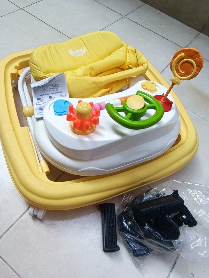 Sarı renkli bebek yürüteci, direksiyon ve oyuncaklı renkli panel ile çocukların ilgisini çeker. Konforlu yumuşak oturma yeri bulunur. Sabitleme aparatları mevcut çok çok az kulanıldı indırımde 800 tl ydı