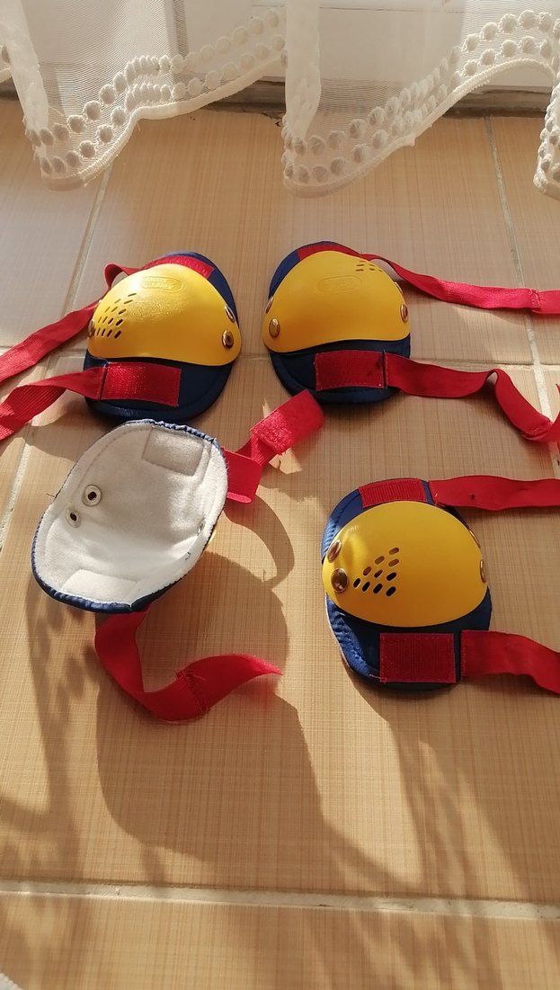 Renkli biker diz koruyucuları, sarı sert kapaklar ve yumuşak kürklü iç kısma sahiptir. Kırmızı cırtcırtlı bantlarla rahatça sabitlenir. ️