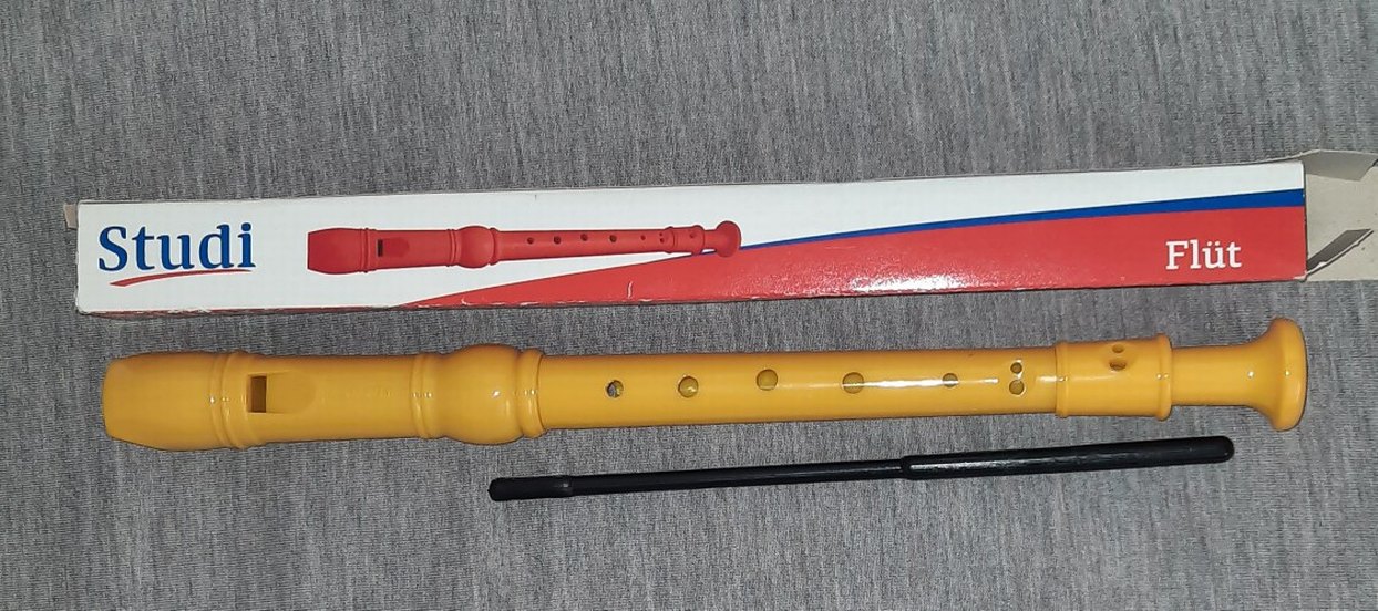 Çeşitli notalar için delikli, sarı renkli ve blokflüt, temizleme çubuğu ile birlikte.