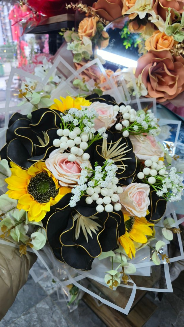 Bu avangart gelin buketi, koyu canlı sarı ayçiçekleri, yumuşak pembe güller, siyah fırfırlı detaylar ve beyaz meyve süslemeleri içerir.
