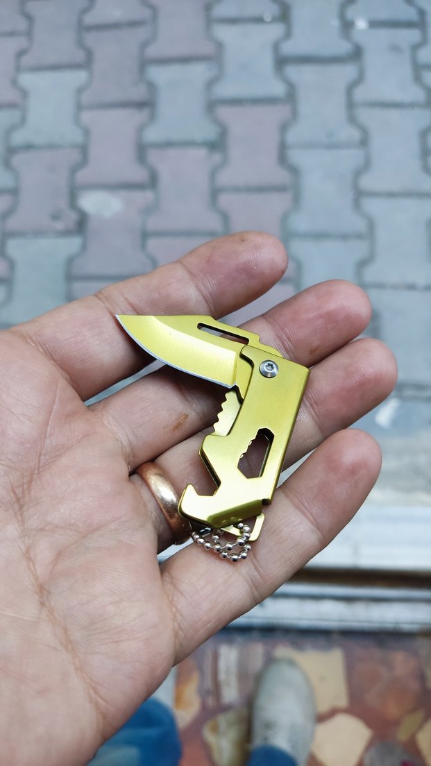 Altın renkli, çok fonksiyonlu katlanabilir bıçak. Şişe açacağı ve tırtıklı kenar gibi özelliklere sahip, taşınması kolay.
