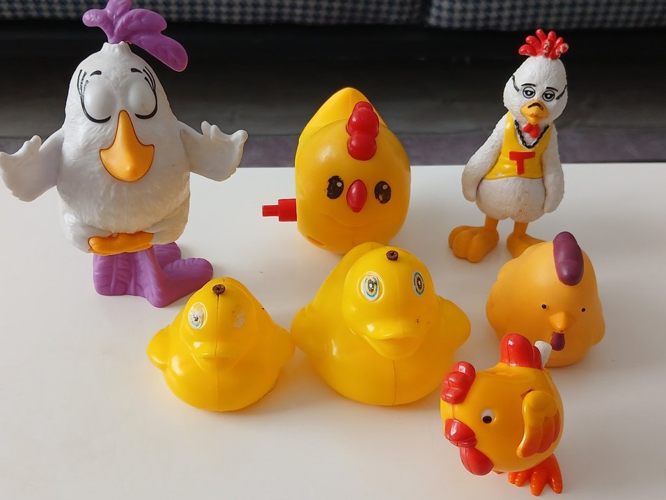 Sarı renkli civciv, ördek ve diğer hayvan figürlerinden oluşan renkli çocuk oyuncakları seti. hepsinin fiyatıdır