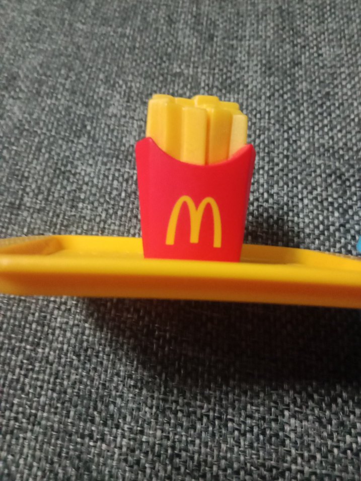 Renkli ve eğlenceli tasarıma sahip sarı renkli çocuk tabak, çatal ve bıçak seti, patates kızartması figürlü detay içerir.