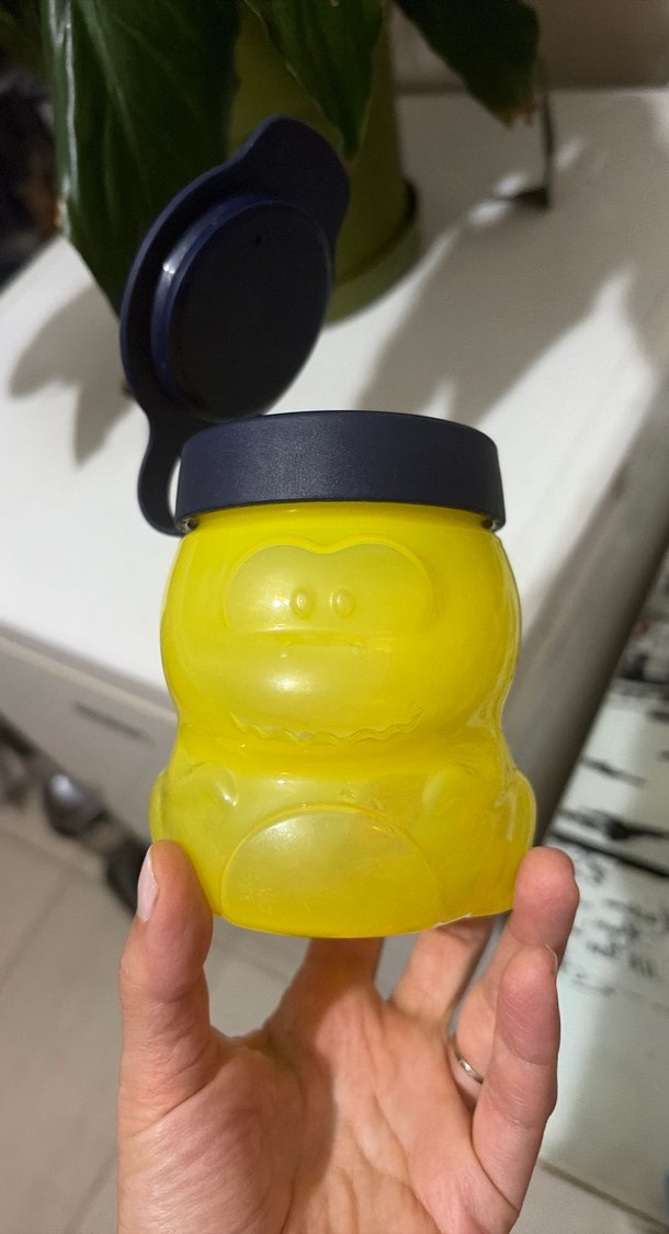 Sarı renkli çocuk termos kutu, renkli tasarımı ve güvenli açılır kapaklı yapısıyla atıştırmalık kutusu olarak kullanılır