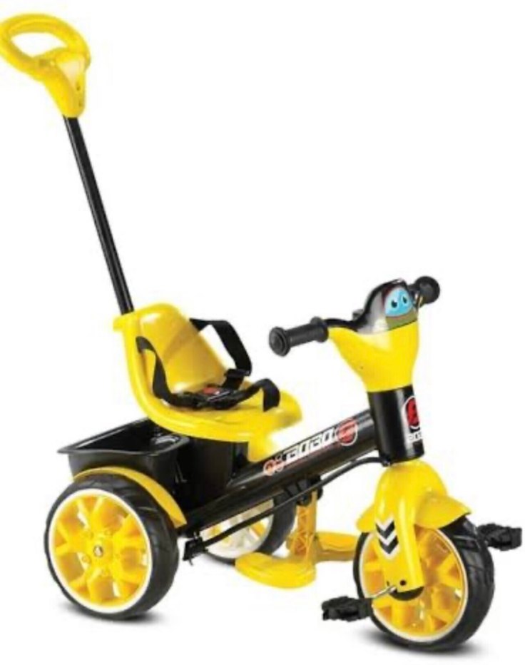 Sarı renkli bu üç tekerlekli bisiklet, emniyet kemerli oturma yeri, ebeveynler için itme sapı ve sağlam tekerlekler içerir.
