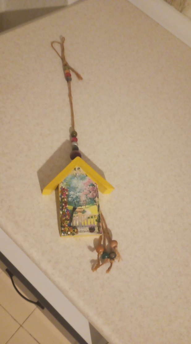 Sarı çerçeveli, renkli boncuklu dekoratif duvar süsü. Manzaralı tasarımı ve ip ile asma imkanı bulunur. Ahşap boncuk detaylıdır.