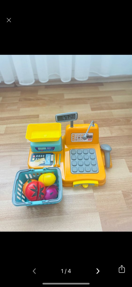 Sarı renkli, barkod okuyucu ve terazi içeren eğitici oyuncak kasası ve plastik meyve sepeti