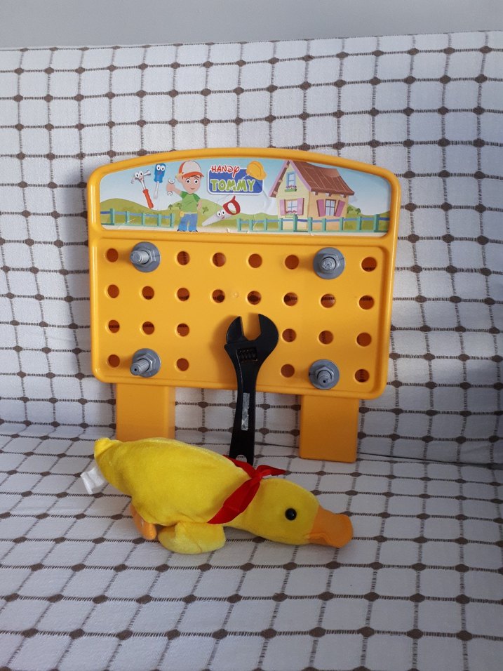 Sarı renkli delikli panel, cıvata ve anahtar ile birlikte peluş ördek içeren renkli eğitici oyuncak seti.