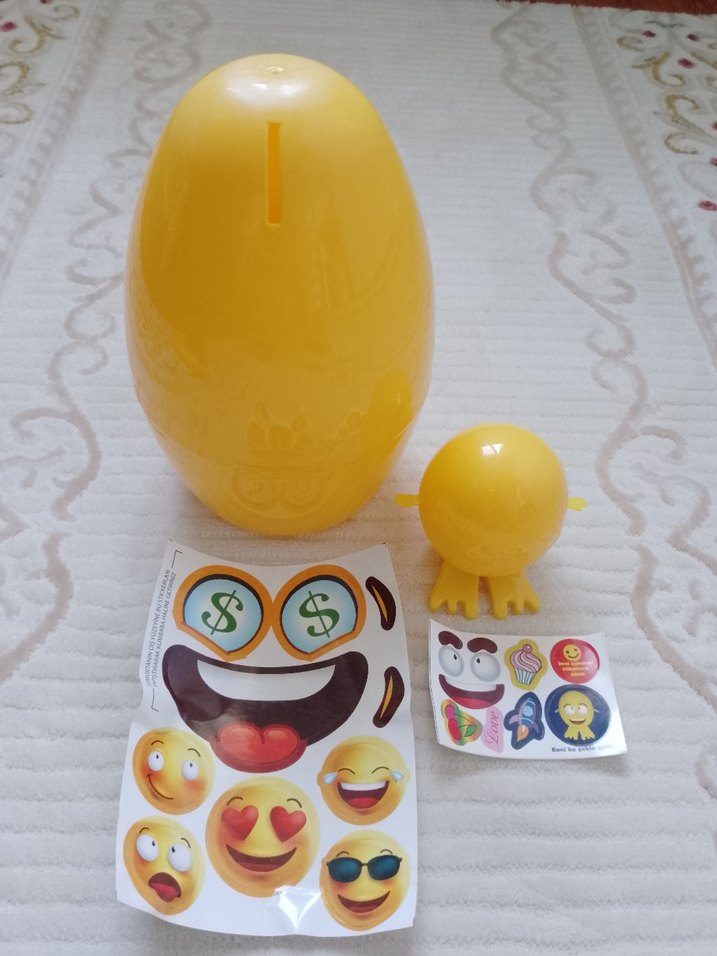 Renkli eğitici oyuncak seti, iki sarı parça ve emoji çıkartma sayfaları içerir. Çocukların oyunla öğrenmesine destek olur. Kumbara